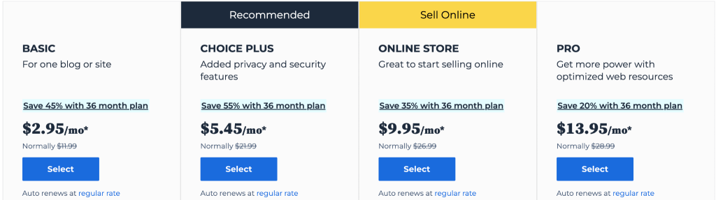 تكلف استضافة بلوهوست 120 دولار أمريكي سنوياً، اي نصف ما تكلفك استضافة WPX. لا نوصي باستخدام خدمة بلوهوست ان كنت تملك متجرً الكترونياً ضخماً، ولكن إن كانت هذه اول مرة لك في عالم انشاء المواقع والمتاجر الالكترونية، فهذا خيار جيد، ويمكنك الترقية لاحقاً.